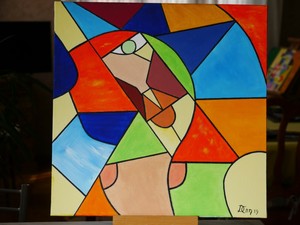 Tete De Femme Au Chapeau Bleu A Ruban Rouge 1939 Cubiste Peinture Tableau En Vente . Tableau femme dans vent fond gris et coloré.